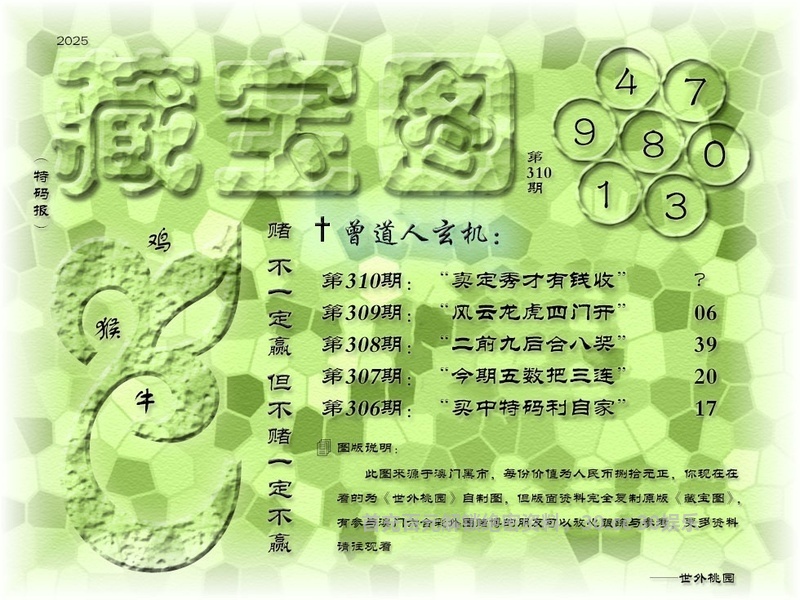 | 308期:九肖 | 马龙狗猪猴鸡鼠兔蛇 | 兔39中 |